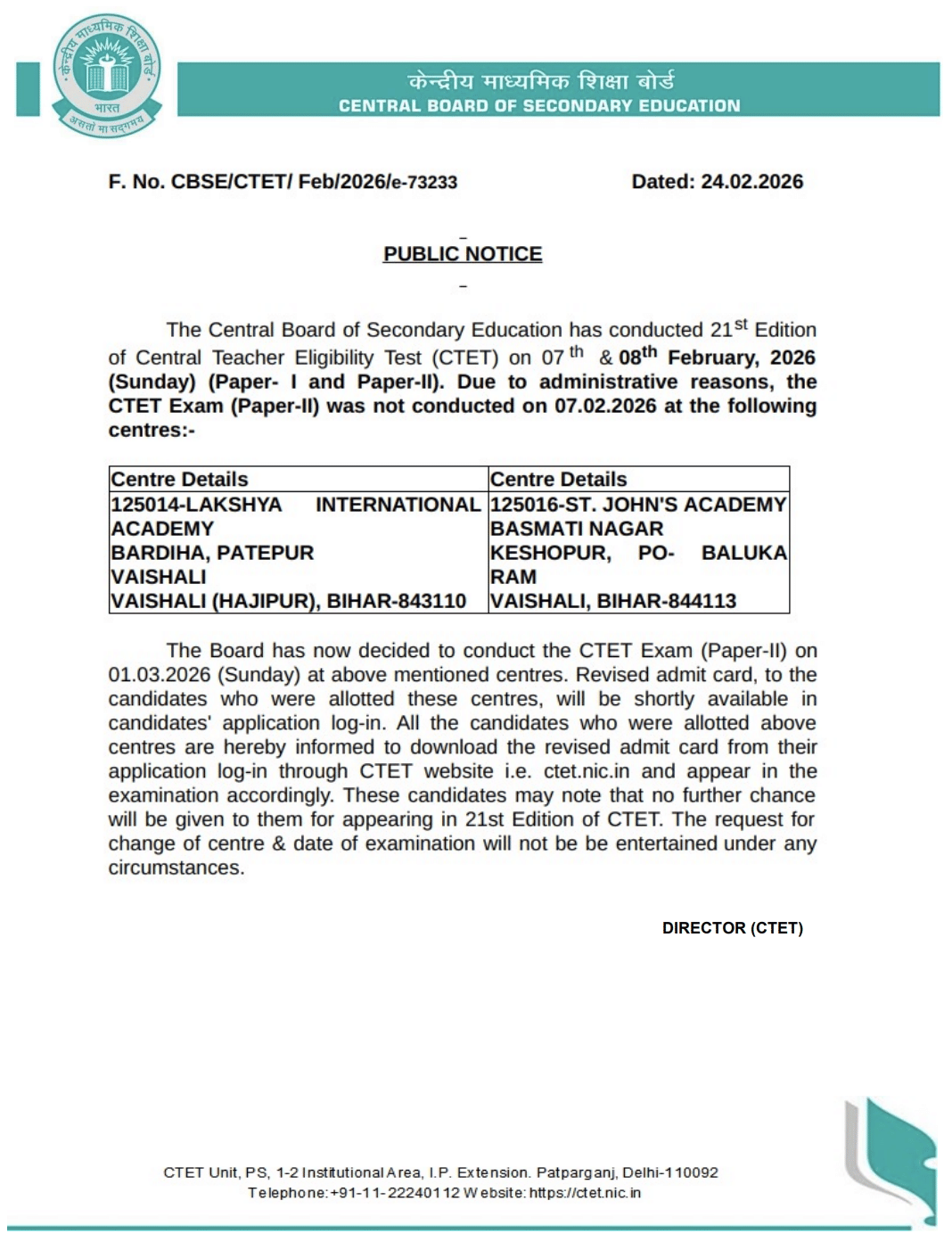 February 25, 2026:The Central Board of Secondary Education has rescheduled CTET 2026 Paper-II to 1 March 2026 for two cancelled Bihar centres. Revised admit cards are now available on the official CTET website for affected candidates. Check Details