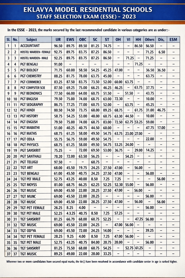 Ans: Yes, EMRS cut-off marks are released post-wise and category-wise for UR, OBC, SC, ST, and EWS categories.