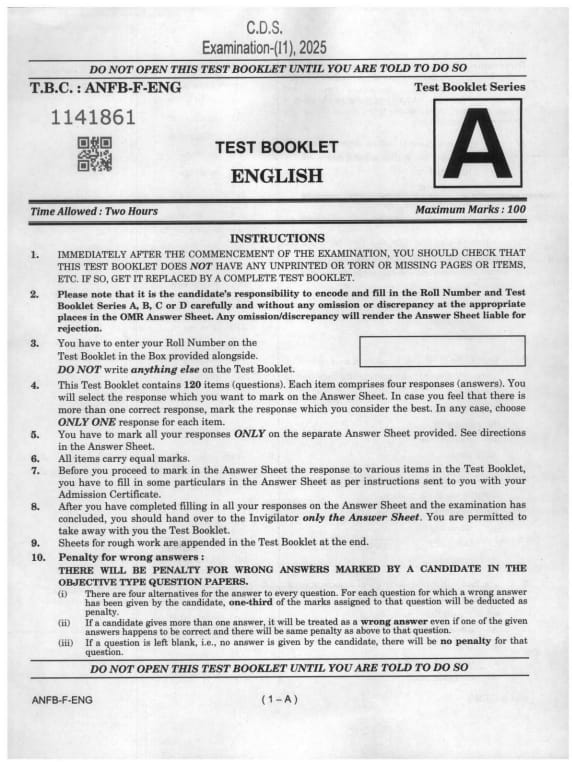 CDS 2025 English Question Paper with Answer Key and Detailed Solution is available here to Download in PDF format. The exam has been conducted by UPSC on September 14, 2025 from 09:00 AM to 11:00 AM. Aspirants can download CDS 2 Answer Key 2025.