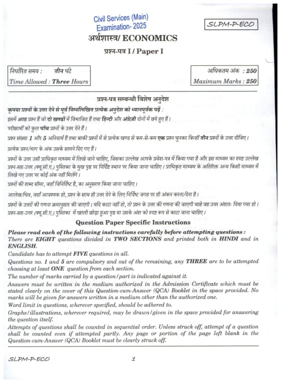 UPSC Mains 2025 Question Paper for Economics Optional Paper 1 is available here to download in PDF Format. The exam has been conducted on August 31, 2025, in Afternoon Session (09:00 PM to 12:00 Noon). This Paper comprises 8 questions which are of 250 marks. The duration of the exam is 3 hours.