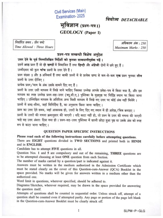 UPSC Mains 2025 Question Paper for Geology Optional Paper 1 is available here to download in PDF Format. The exam has been conducted on August 31, 2025, in Afternoon Session (09:00 PM to 12:00 Noon). This Paper comprises 8 questions which are of 250 marks. The duration of the exam is 3 hours.