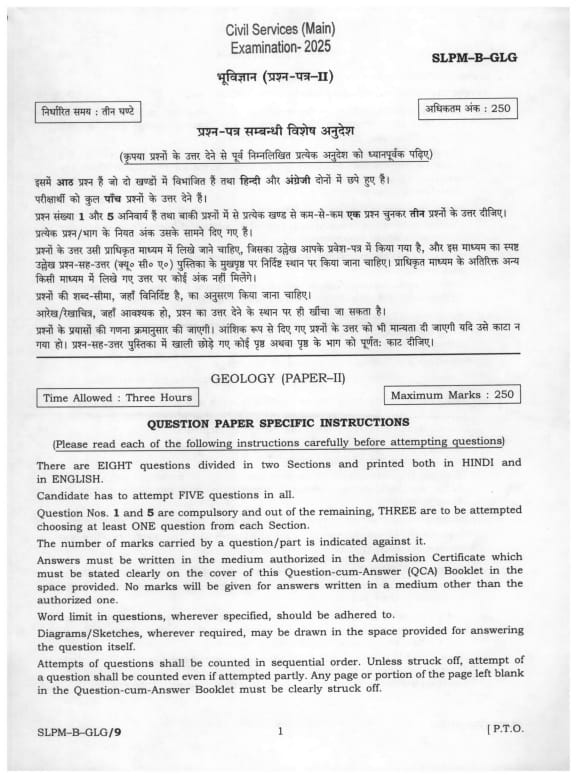 UPSC Mains 2025 Question Paper for Geology Optional Paper 2 is available here to download in PDF Format. The exam has been conducted on August 31, 2025, in Afternoon Session (02:30 PM to 05:30 PM). This Paper comprises 8 questions which are of 250 marks. The duration of the exam is 3 hours.