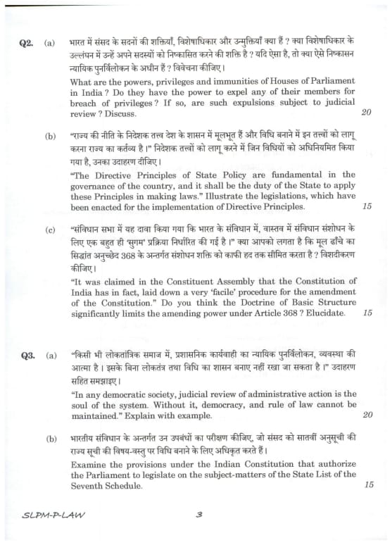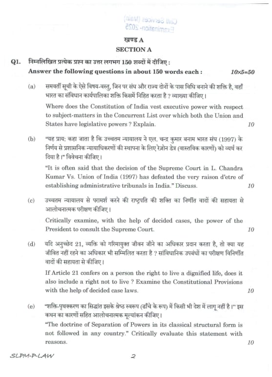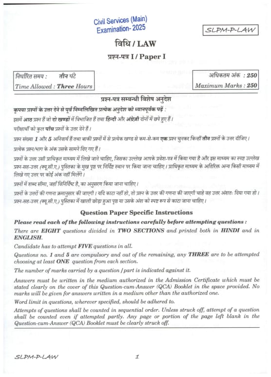 UPSC Mains 2025 Question Paper for Law Optional Paper 1 is available here to download in PDF Format. The exam has been conducted on August 31, 2025, in Afternoon Session (09:00 PM to 12:00 Noon). This Paper comprises 8 questions which are of 250 marks. The duration of the exam is 3 hours.