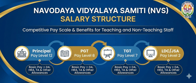 NVS post-wise salary structure differs for each teaching position based on the level of appointment, academic responsibilities, and experience. Navodaya Vidyalaya Samiti teacher salary is regulated under the 7th Central Pay Commission, ensuring fair pay, job security, and long-term financial growth. Candidates selected for posts such as Principal, PGT, TGT, and PRT receive a fixed basic pay along with admissible allowances, making the overall NVS remuneration package highly attractive.