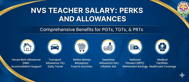 Ans: The House Rent Allowance for NVS teachers is provided as per 7th Pay Commission norms and typically ranges from 8% to12% depending on the city classification (X, Y, or Z).