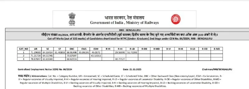 RRB NTPC Bengaluru CBT 2 Cutoff Level 5