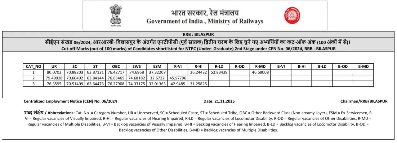 RRB Bilaspur NTPC CBT 2 (Mains) Cutoff