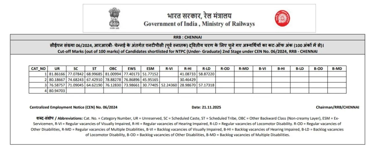 RRB NTPC Chennai CBT 2 (Mains) Cutoff