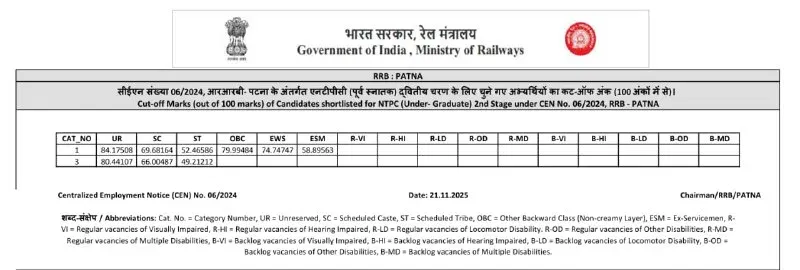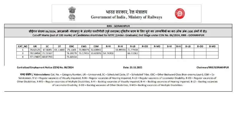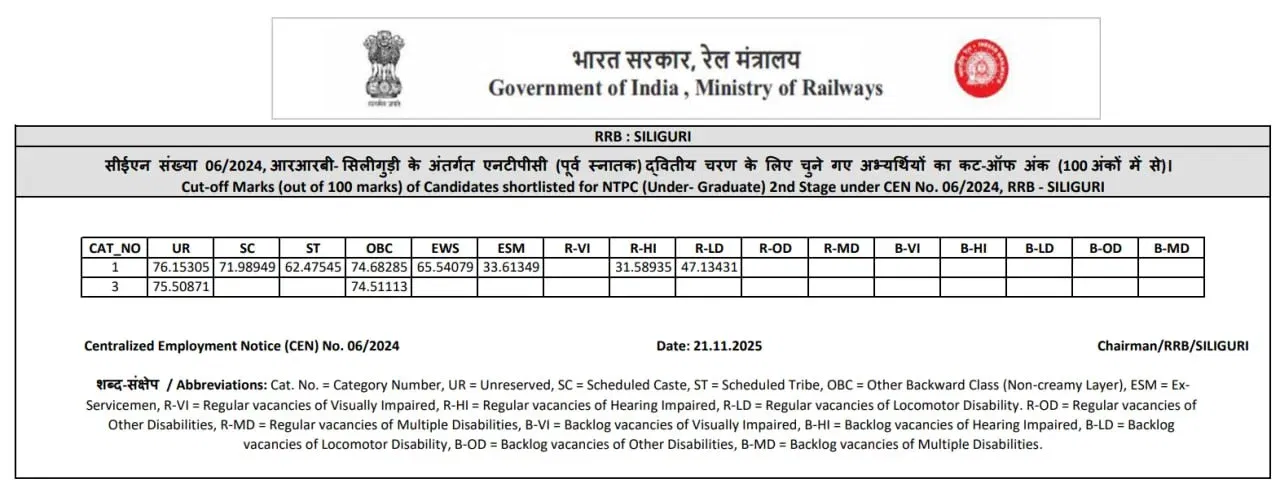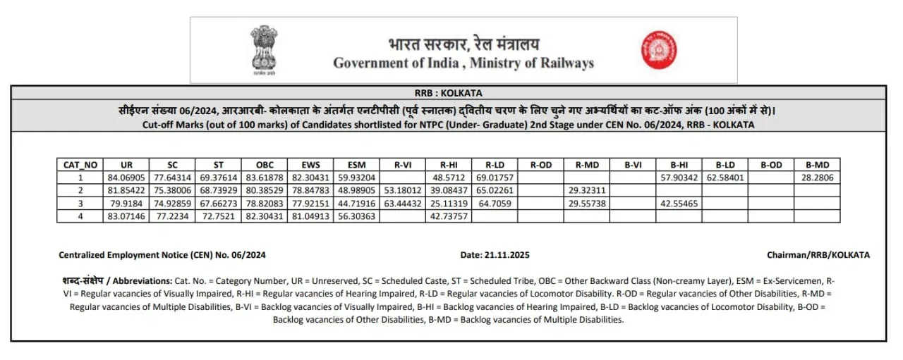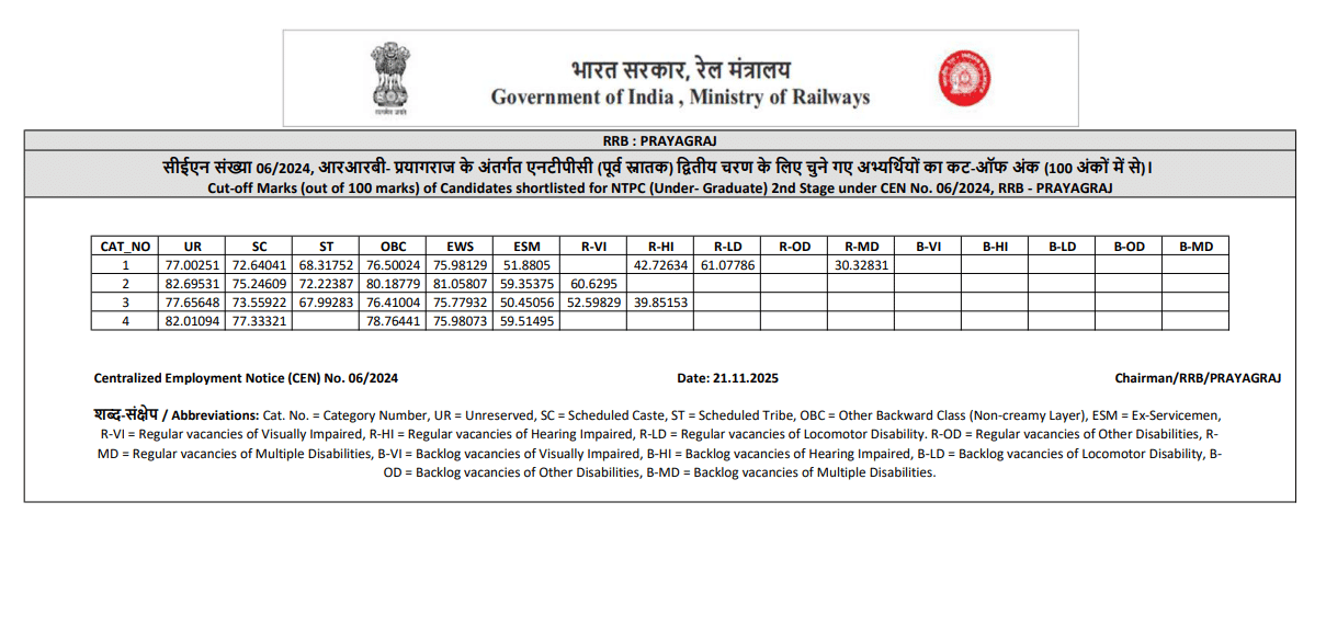 RRB NTPC CBT 1 2025 for undergraduate-level posts has been released for all the RRBs on November 21, 2025. RRB releases CBT 1 cutoff PDF for each of its regional RRBs. This cutoff indicates the marks that the qualified candidates got in their Non-Technical Popular Categories (NTPC) exam. The cutoff varies with category, different zones, and the level of posts. This cutoff is based on certain factors such as vacancy numbers, exam difficulty, and candidate performance etc.