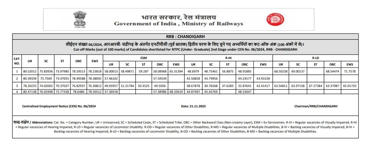 RRB NTPC Chandigarh CBT 2 (Mains) Cutoff