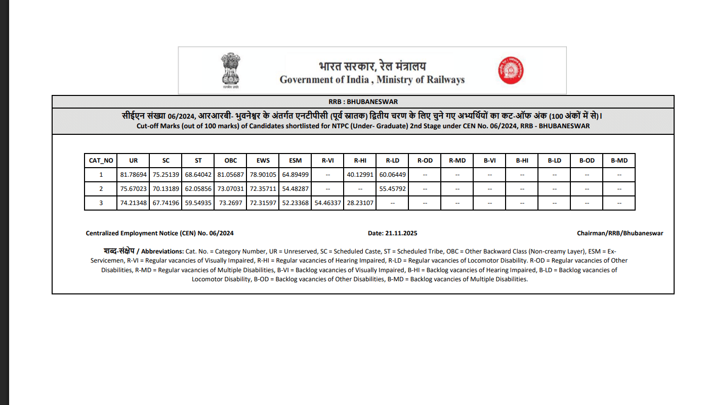 RRB Bhubaneswar NTPC CBT 2 (Mains) Cutoff