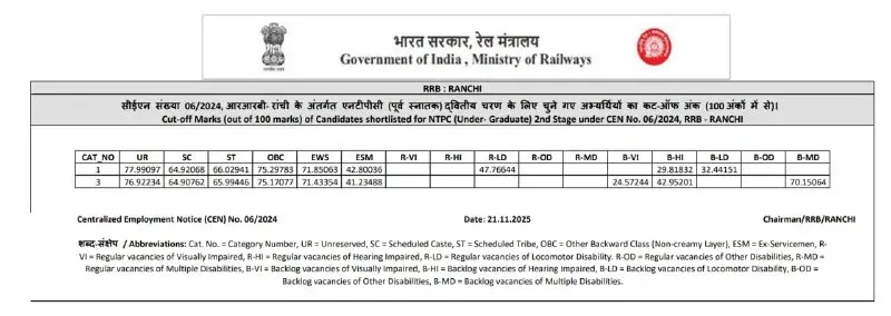 RRB NTPC Ranchi CBT 2 (Mains) Cutoff
