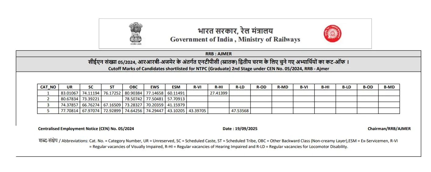 RRB NTPC Ahmedabad CBT 2 Cutoff Level 5